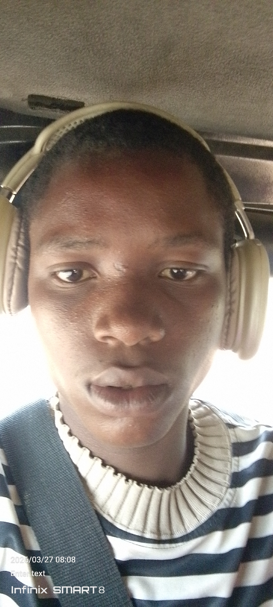 The image displays a close-up selfie of an individual with dark skin, short dark hair, dark eyes, and full lips, looking directly at the camera with a neutral expression. The individual is wearing beige over-ear headphones. Their attire includes a long-sleeved shirt with horizontal dark blue and white stripes, featuring a ribbed, beige, ruffled collar. A dark-colored seatbelt crosses the individual's upper torso diagonally from the viewer's upper left to lower right. The background is an indistinct, light grey interior, consistent with the inside of a vehicle. A timestamp "2023/03/27 08:08" and device information "Infinix SMART 8" are visible in the lower left corner. The specific location within the city of Ejemekwuru, Nigeria, is not visually identifiable within the photograph.
