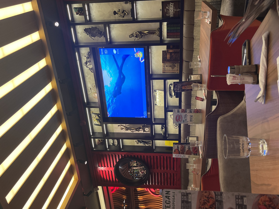 The image displays the interior of a restaurant, identified as a Happy Bar & Grill establishment located in Sandanski, Bulgaria. The perspective is from a dining table, looking across the dining area towards a prominent decorative wall. The ceiling features a series of six parallel, elongated rectangular light fixtures embedded within a light-colored wooden structure. Below the ceiling, a dark band of wall contains recessed spotlights. The central feature of the back wall is a large, wall-mounted flat-screen television displaying an underwater scene with the silhouette of a person swimming or free-diving, wearing fins, against a blue background. The television screen also shows "19:00" and "11°C" as an overlay. This television is integrated into a dark, multi-compartment shelving unit, with each compartment internally illuminated. The shelves contain various decorative objects, including statuettes (e.g., a female figure, a jazz musician), model vehicles (a motorcycle, a bicycle, a vintage car), decorative books, a vintage rotary telephone, and a sign displaying "ROYAL AWL WHISKEY." To the left of the shelving unit, the wall is paneled with red vertical slats or shutters, upon which a circular mirror is mounted, reflecting elements of the restaurant. Further to the left, a curved, undulating wooden wall section is visible, illuminated with a red backlight. In the foreground, a wooden dining table is set with an empty, faceted clear glass, a folded white napkin, a metal fork, and a set of salt and pepper shakers. A dark-colored smartphone is partially visible on the table. In the mid-ground, several other wooden dining tables are arranged with booth seating upholstered in dark brown and individual chairs in red and beige/grey fabric. These tables are equipped with menus, including one titled "Happy Постно меню" (Happy Lenten Menu) in Cyrillic, and empty clear glasses. No individuals are visible within the depicted scene.