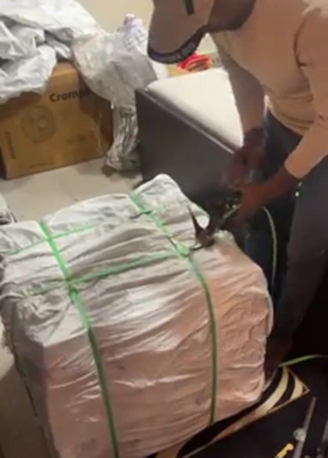 A man wearing a light tan hat, a tan long-sleeved shirt, and dark jeans is crouched over a large package, cutting its green plastic straps with a hand-held tool