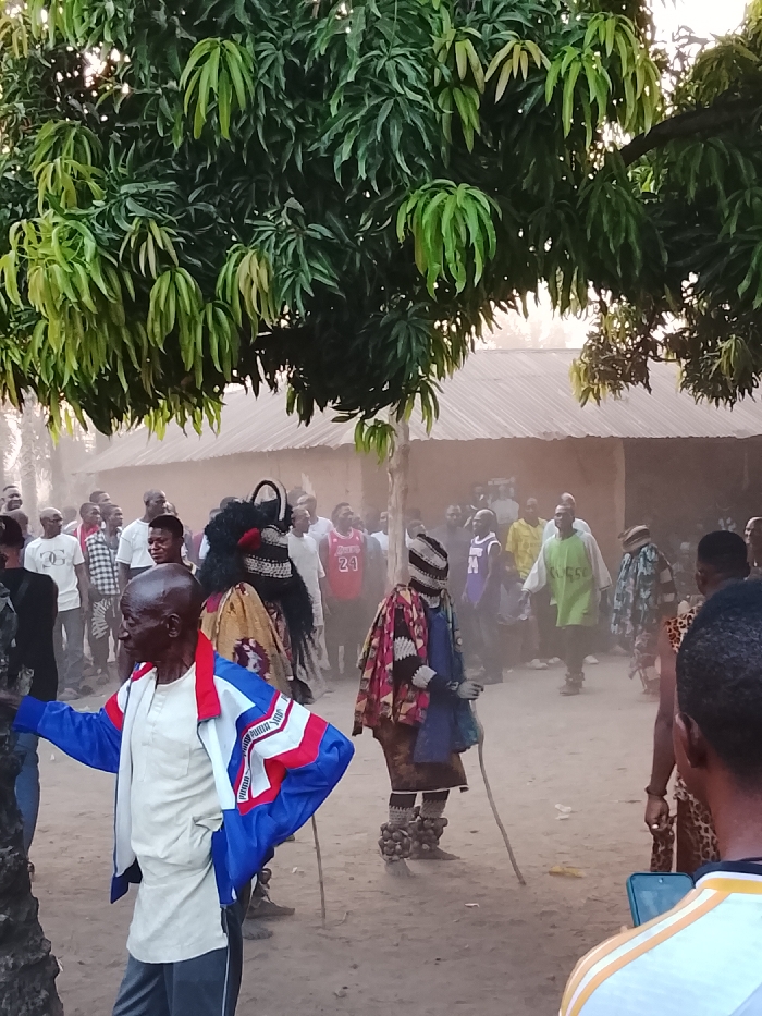 The image captures an outdoor gathering in Tabu, Nigeria, on an unpaved, dusty ground surface under a large tree with dense green foliage. In the hazy background, several single-story buildings with light-colored roofs are visible. A crowd of approximately 30-40 individuals, predominantly men, are present. Two masked figures, identified as masquerades, are central. The leftmost masquerade exhibits a dark, shaggy headpiece with white accents and a body adorned with layered, patterned fabrics. The rightmost masquerade wears a patterned cloak with geometric designs, a striped head covering, and traditional leg coverings made of spherical objects, holding a long, thin stick. In the foreground left, an older man with dark skin and a bald head stands in profile, wearing a light-colored shirt and a blue, white, and red jacket with "PUMA" branding. In the foreground right, the back of a younger person's head and shoulder are visible; this individual holds a smartphone horizontally, appearing to record the event. Onlookers in the background wear casual clothing, including various t-shirts, some featuring sports team logos. The scene depicts a cultural or ceremonial event in a communal outdoor setting.