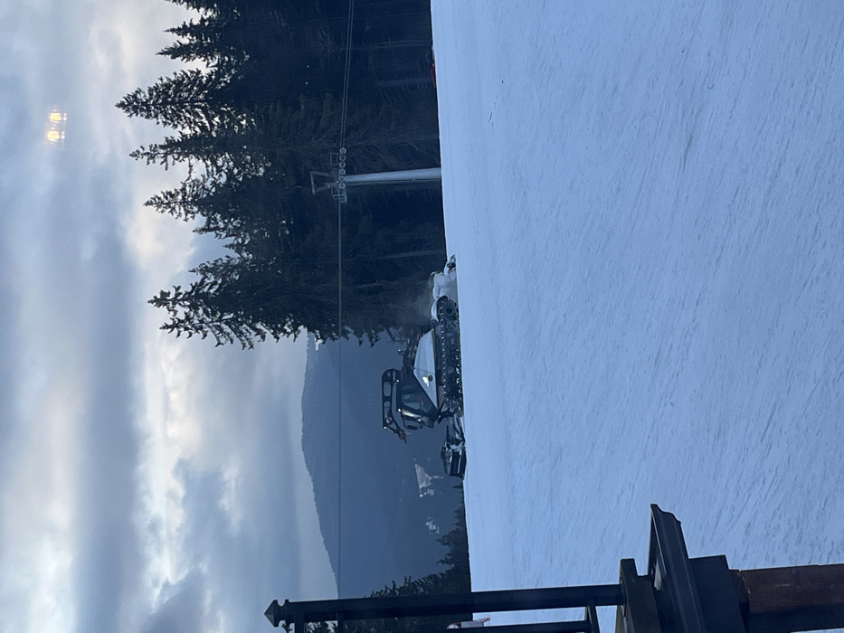 The image depicts a snow-covered ski slope in Stoikite, Bulgaria, under an overcast sky, likely during dusk or dawn. In the midground, a large, silver-grey and black snow groomer with tracks is actively moving rightward across the slope, pushing snow, indicated by disturbed snow behind its rear and a faint plume. No operator is visible within its cabin. In the immediate foreground, to the lower left, a dark wooden support post and a section of a dark, horizontal structure, possibly a railing or roof edge, partially obscure the view. The background features a dense, dark evergreen forest of conifers and a grey ski lift pole positioned within the trees to the right of the groomer. Farther in the background, dark, tree-covered mountain ranges are visible beneath a mostly grey, cloudy sky. Two distinct, bright artificial lights are visible high in the upper right sky, suggesting a light source out of frame. The environment is marked by extensive snow cover typical of winter.