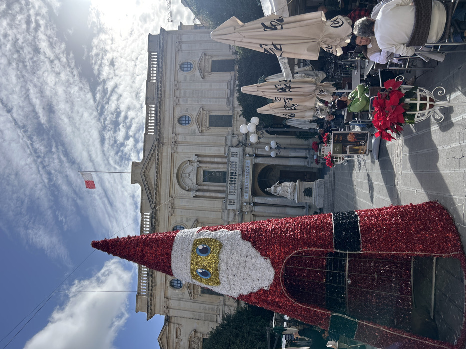 The scene depicts Republic Square in Valletta, Malta, on a daylight, partially cloudy day. A large, conical Santa Claus Christmas decoration, constructed with red and white tinsel-like material, featuring a golden face and blue eyes, occupies the left foreground. Its lower section includes a black band and exposed internal framework. To the right, an outdoor cafe area is visible, equipped with numerous beige, folded umbrellas displaying "Coca-Cola" logos. Several patrons are seated at tables; one individual in a white sweater is seen from behind in the lower right, and another in a green jacket is seated further back. White ornate planters holding red poinsettias are positioned between tables. The prominent background building is the National Library of Malta (Bibliotheca), a classical stone structure with "BIBLIOTHECA" inscribed above its main arched entrance. A white marble statue of Queen Victoria stands on a pedestal directly in front of the library's entrance. A red and white Maltese flag flies from a flagpole on the library's roof. The sky exhibits scattered white clouds against a blue background, with sunlight originating from the upper right.