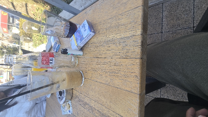 The image depicts an outdoor café table scene in Pleven, Bulgaria, viewed from the perspective of a seated individual. The table is made of light-brown wooden planks. On the table, from left to right: * A tall, clear glass, approximately one-quarter full with a light-brown, frothy liquid (consistent with a coffee beverage), containing a single black straw. * To the left of the glass, a circular metal ashtray contains multiple cigarette butts and several coins, including two visible Euro coins. * An empty, clear glass Coca-Cola bottle with a red label partially visible. * Behind the Coca-Cola bottle, a partially obscured glass containing an orange liquid. * A white disposable lighter is positioned next to the Coca-Cola bottle. * To the right of the lighter, a pack of Winston Blue cigarettes is prominently displayed, resting on the table. * Further to the right, a second clear glass containing a dark liquid (possibly cola) with a black straw. * Another pack of cigarettes, similar in appearance to the Winston Blue, is partially visible behind the dark liquid glass. A person wearing a white, quilted jacket is partially visible seated to the left of the table, behind the tall glass. The photographer's legs, clad in dark-colored trousers, are visible in the lower foreground, along with a portion of their left hand. The ground beneath the table is paved with grey, rectangular tiles or cobblestones. The background reveals an urban outdoor environment, suggesting a pedestrian area or boulevard. Green foliage and bushes are visible. In the distance, a building with a red sign, possibly featuring a yellow "T" logo, is discernible under bright daylight conditions. A metal railing or support structure is visible on the right side of the frame, extending from the table area into the background.