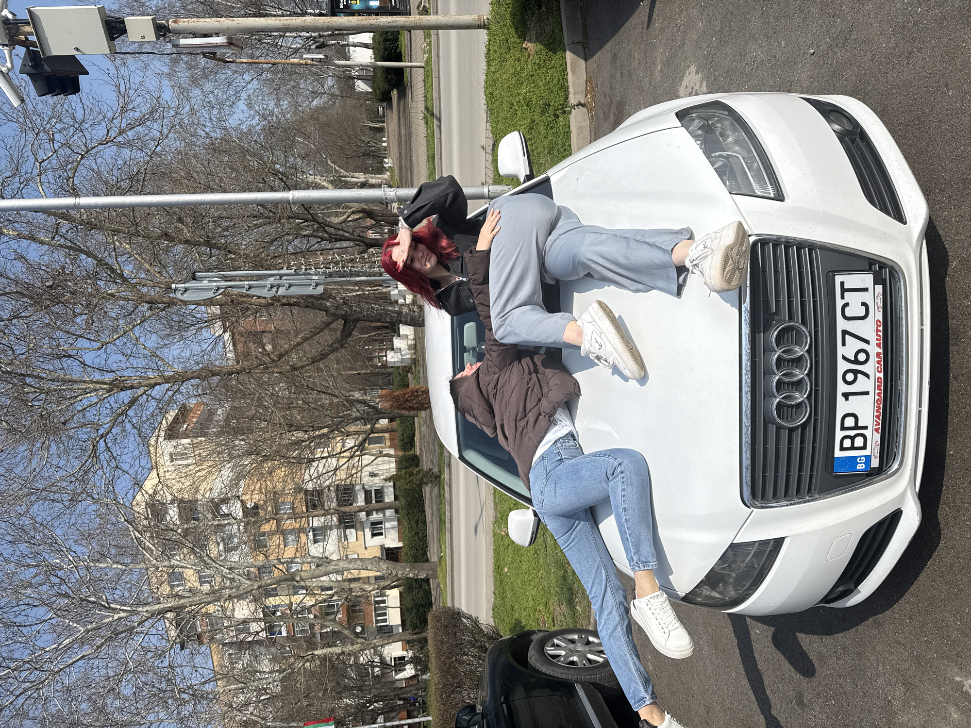 - "The scene depicts two young females interacting with a white Audi car parked on asphalt pavement in Kozloduy, Bulgaria, under a clear blue sky" by FM-cSrrR2, licensed under CC BY 4.0
