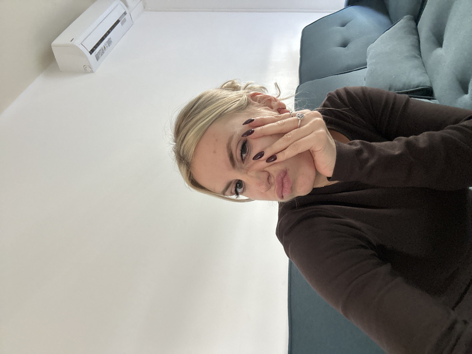 A female individual with blonde hair pulled back is depicted indoors, in what is identified as a location in Cannes, France. She is positioned to the left of the frame, making a distinct "pouty" expression by pursing her lips and scrunching her nose, while looking directly forward. Her left hand, featuring dark reddish-purple nail polish and a silver-colored ring with a circular design on the ring finger, is pressed against her left cheek. She wears a dark brown long-sleeved top. Behind her is a teal or dark blue upholstered sofa with visible button tufting and at least one matching cushion. The walls are plain white, and a white wall-mounted air conditioning unit is present in the upper right portion of the image, near the ceiling. The scene is brightly illuminated.
