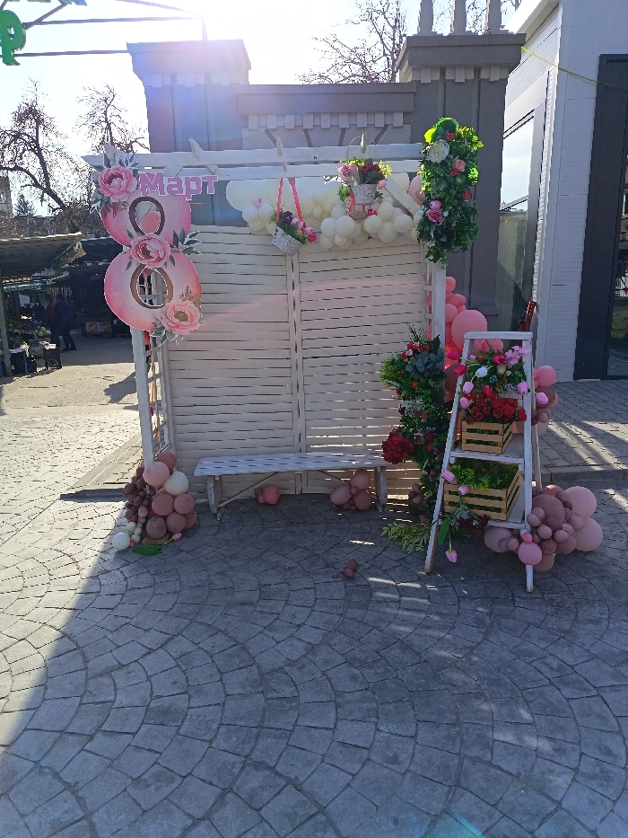 An outdoor decorative display is situated on a grey paved area with a fan-like pattern, under bright sunlight, in the city of Unknown, Unknown. The central feature is a white slatted wooden screen, behind which bare tree branches and a modern building are visible. To the left of the screen, a large pink cut-out "8" decorated with floral patterns stands on a white vertical post, with the Cyrillic word "Март" (March) spelled above it. A garland of white and pale pink balloons stretches across the top of the screen, from which two white hanging baskets containing pink and red artificial flowers are suspended. A simple, light-colored wooden bench is positioned in front of the screen. To the right, a white wooden ladder-shelf unit displays two wooden crates filled with artificial flowers and foliage; red and pink blooms on the top shelf, and green foliage with pink flowers on the bottom. Clusters of pink and maroon balloons are arranged at the base of the setup and scattered on the pavement. In the left background, an open-air market with stalls and several indistinct figures is visible. No specific actions or interactions with the decorative display are depicted.