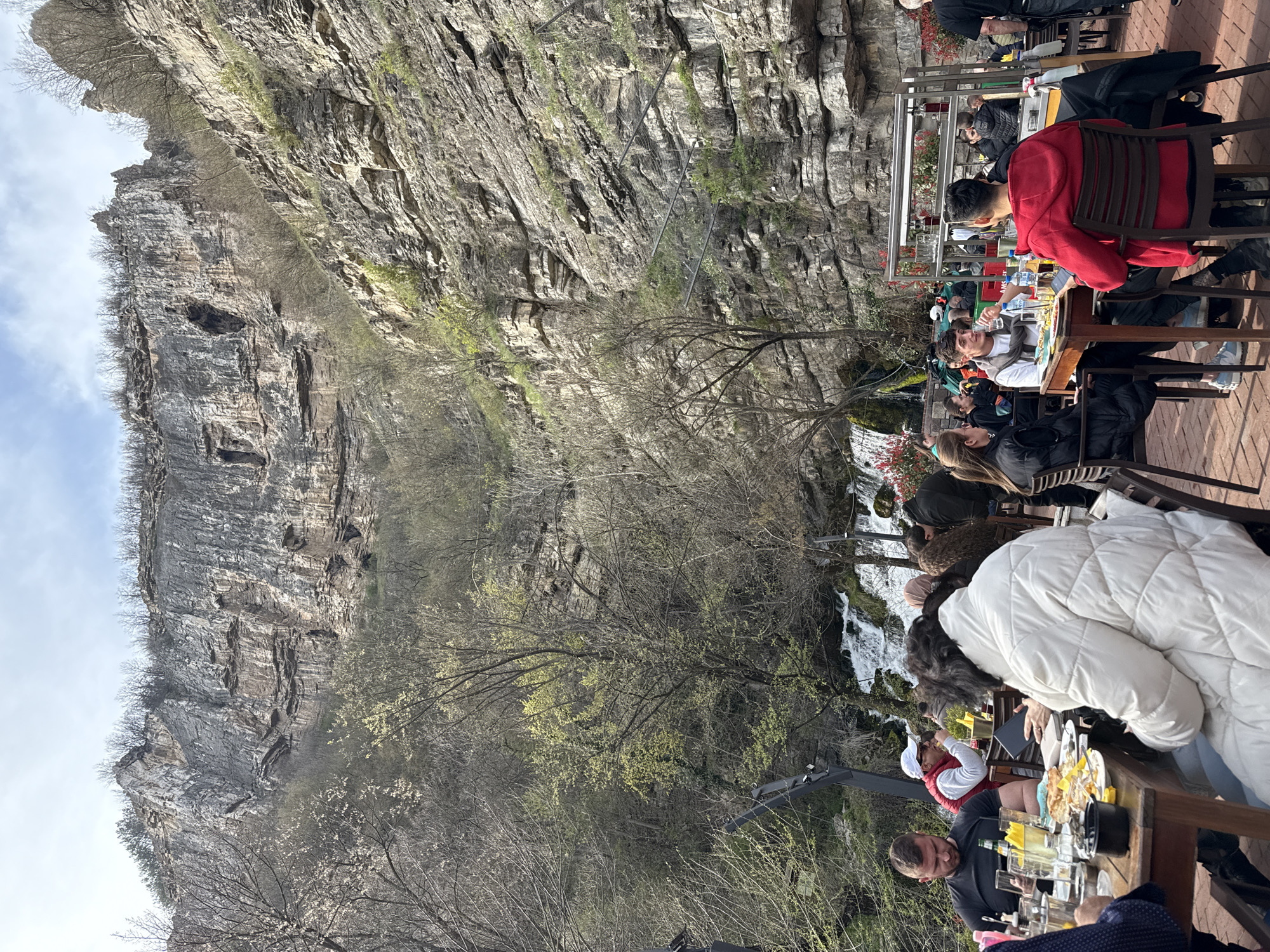 The image depicts an outdoor dining area adjacent to a large, layered rock cliff face in Milanovo, Bulgaria. Several people are seated at wooden tables, some engaged in conversation and others appearing to be eating or drinking. Various dishes and glassware are visible on the tables. A small waterfall cascades down the cliff face behind the dining area, surrounded by bare trees with early signs of spring foliage. The overall environment suggests a restaurant or cafe integrated into the natural landscape.