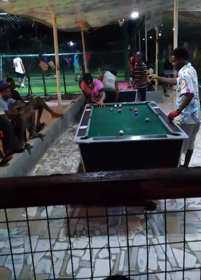 group of people in an outdoor, covered area playing pool. There is a pool table with several colored balls and a white cue ball on it. One person is leaning over the table, aiming the cue stick. Another person stands nearby, gesturing with his hands. Other people are seated on a raised platform or watching the game. In the background, there's a fenced area where people seem to be playing soccer or another sport. The area is lit with overhead lights, and the ground is tiled. The video is shot from behind a fence, partially obstructing the view.