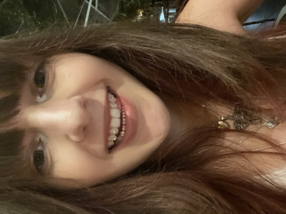 A close-up, frontal portrait features an individual smiling directly at the camera. The scene reportedly takes place in Hod HaSharon, Israel. The subject is a female with long, dark brown hair with reddish highlights, bangs across the forehead, and hair framing both sides of the face. Her eyes are open, looking forward. She exhibits a wide, open-mouthed smile, revealing both upper and lower teeth. Multiple small, clear or silvery adornments are attached to the visible surfaces of her upper anterior teeth. Along the gum line or upper aspect of the lower lip, a row of small, spherical, possibly pink or gold-toned adornments are visible, partially obscuring the lower teeth. The subject is wearing a light-colored, possibly white, garment. Multiple necklaces are visible, including a prominent silver-toned pendant shaped like an ornate elephant or similar creature, a smaller pendant below it, and a small gold-toned heart charm. The background is dark and out of focus, indicating an indoor or covered outdoor setting at night, with indistinct blurry shapes and light sources visible.