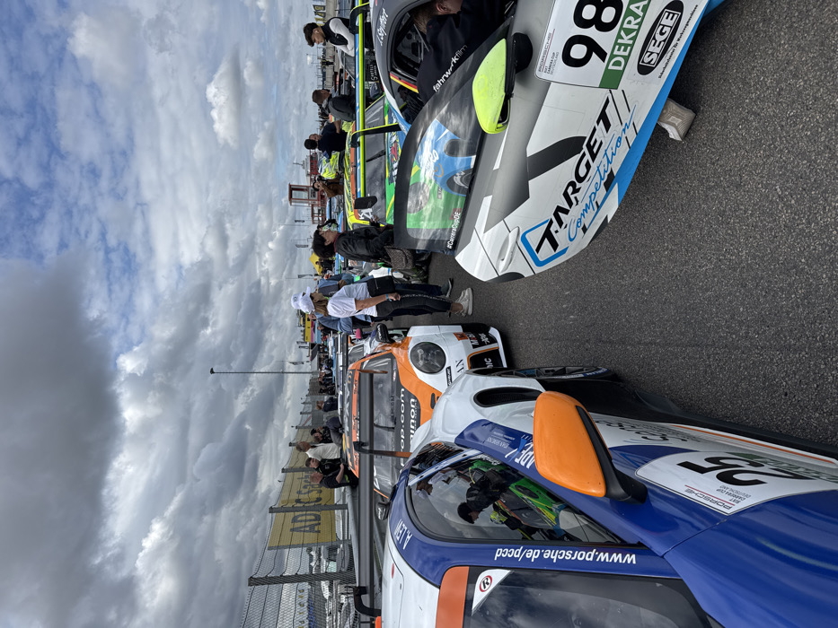 The image depicts a race event paddock or grid at the Sachsenring circuit in Hohenstein-Ernstthal, Germany. Under an overcast sky, multiple race cars are staged on an asphalt surface. In the immediate foreground left, a white and blue Porsche 911 GT3 Cup car, number 25, with an orange side mirror and "www.porsche.de/pccd" branding, is prominently displayed. Adjacent to it, an orange and white Porsche 911 GT3 Cup car is positioned. On the immediate foreground right, a white race car with black and light blue "TARGET Competition" graphics and number 98 is visible. Numerous other race cars, primarily Porsche 911 GT3 Cup models, are discernible in the mid-ground. Approximately 15 to 20 individuals, dressed in casual attire and some in team apparel, are scattered throughout the scene, standing, observing the vehicles, and conversing. A chain-link fence, topped with a yellow banner displaying "ADAC Sachsen", extends across the background, behind which additional vehicles and a red tower structure are visible. The overall environment indicates a live motorsport event.