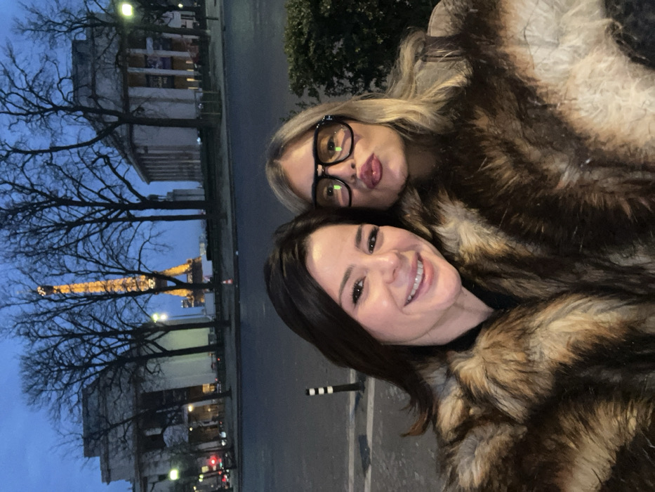 Two women are posing closely together in a selfie. The woman in the foreground has dark hair and is smiling broadly. The woman behind her has blonde hair and is wearing large glasses. Both women are wearing fur coats. In the background, the Eiffel Tower is visible, framed by bare trees and a large building. The lighting suggests it is evening or dusk. A black and white bollard stands near the edge of the road.