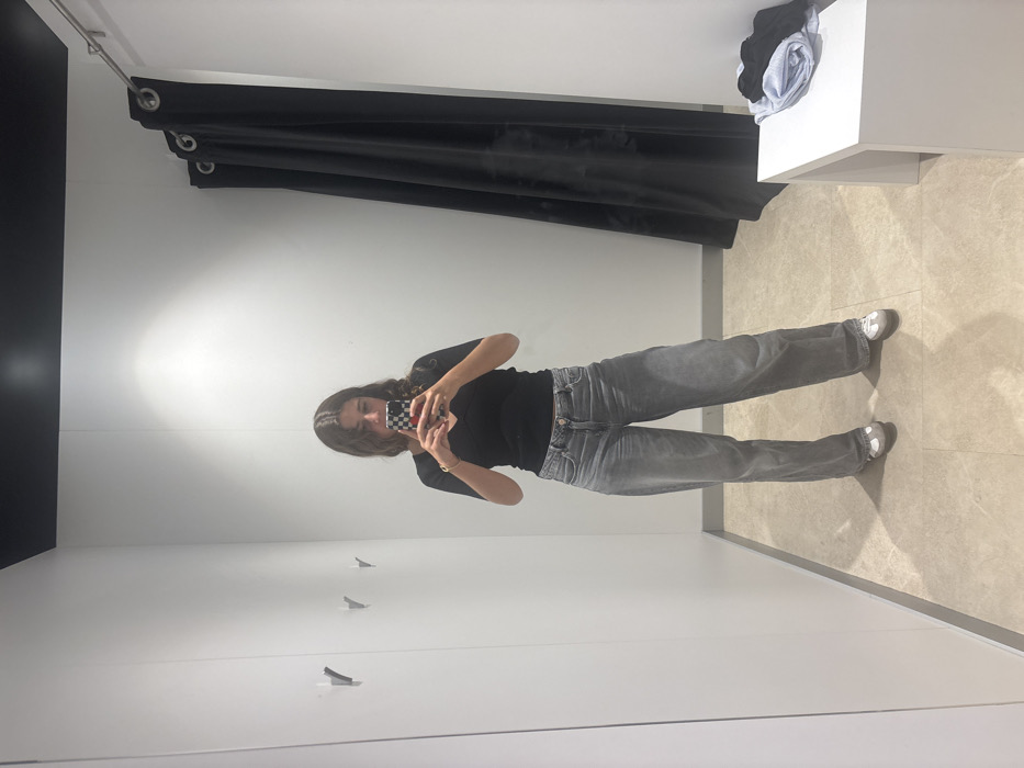A young woman is depicted in a full-body mirror selfie within a retail fitting room, located in Lisbon, Portugal. She has long, dark, wavy hair and wears a black short-sleeved V-neck top, faded grey wide-leg jeans, and white sneakers. Her left wrist displays a thin gold-colored bracelet. She holds a smartphone with a black and white checkered case at chest level, facing the mirror to capture the reflection. The fitting room features white paneled walls, a black ceiling, and a light-colored tiled floor. Three minimalist white hooks are visible on the left wall. To the right, a black privacy curtain hangs from a silver rod. A white rectangular bench or stool is positioned in the lower right corner, holding folded garments, including a light blue shirt and a black item. Overhead lighting creates a bright spot on the back wall, illuminating the scene.