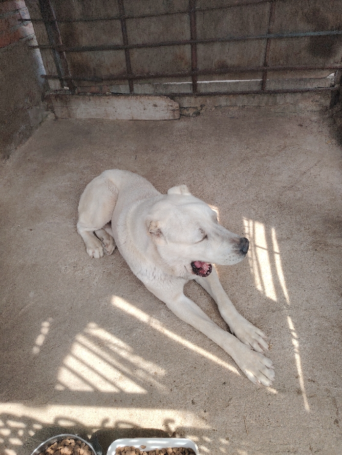 - "The image depicts a large, light-furred dog lying on a concrete surface within an enclosure" by FM-X84Fh1, licensed under CC BY 4.0
