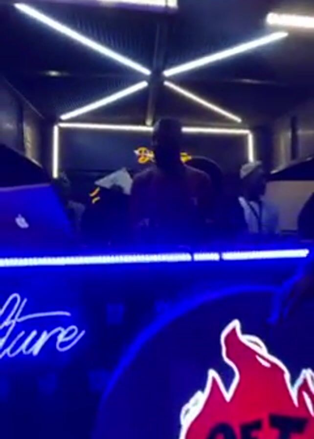 The video takes place in a club or bar with a DJ booth. A DJ in an orange shirt is working the turntables, with a laptop to his left. Other men, some wearing traditional hats, stand around the booth. The bar is lit with neon signs that say "Get Me Lit" and "Dose". The ceiling has geometric lighting fixtures. The DJ is adjusting his headphones and appears to be interacting with the music. The lighting changes throughout the video, alternating between blue and yellow. The sound of music is audible.