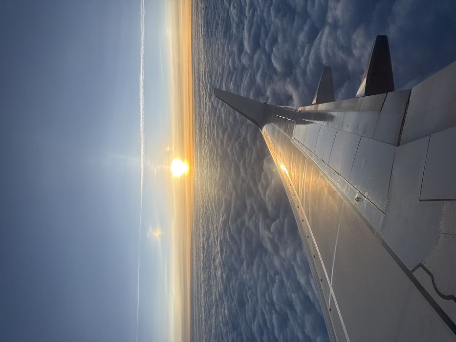 An aerial photograph depicts an aircraft's wing and the sky above a dense cloud layer, indicative of sunrise or sunset