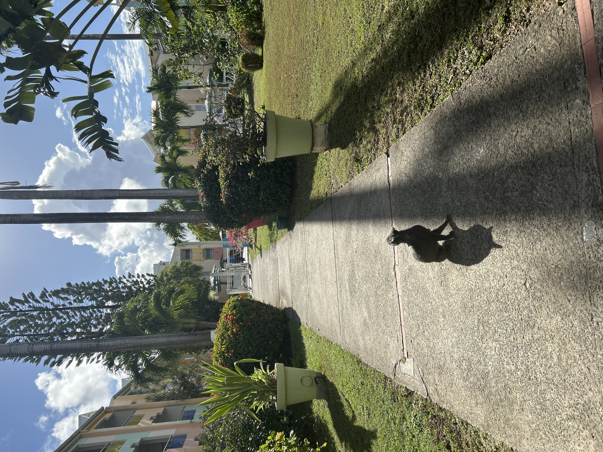 On a sunlit concrete sidewalk in Le Gosier, France, a dark-colored cat stands casting a shadow. The sidewalk is flanked by green grass and various plants, some in large, light-green pots. Buildings and palm trees line the background, under a blue sky with white clouds.