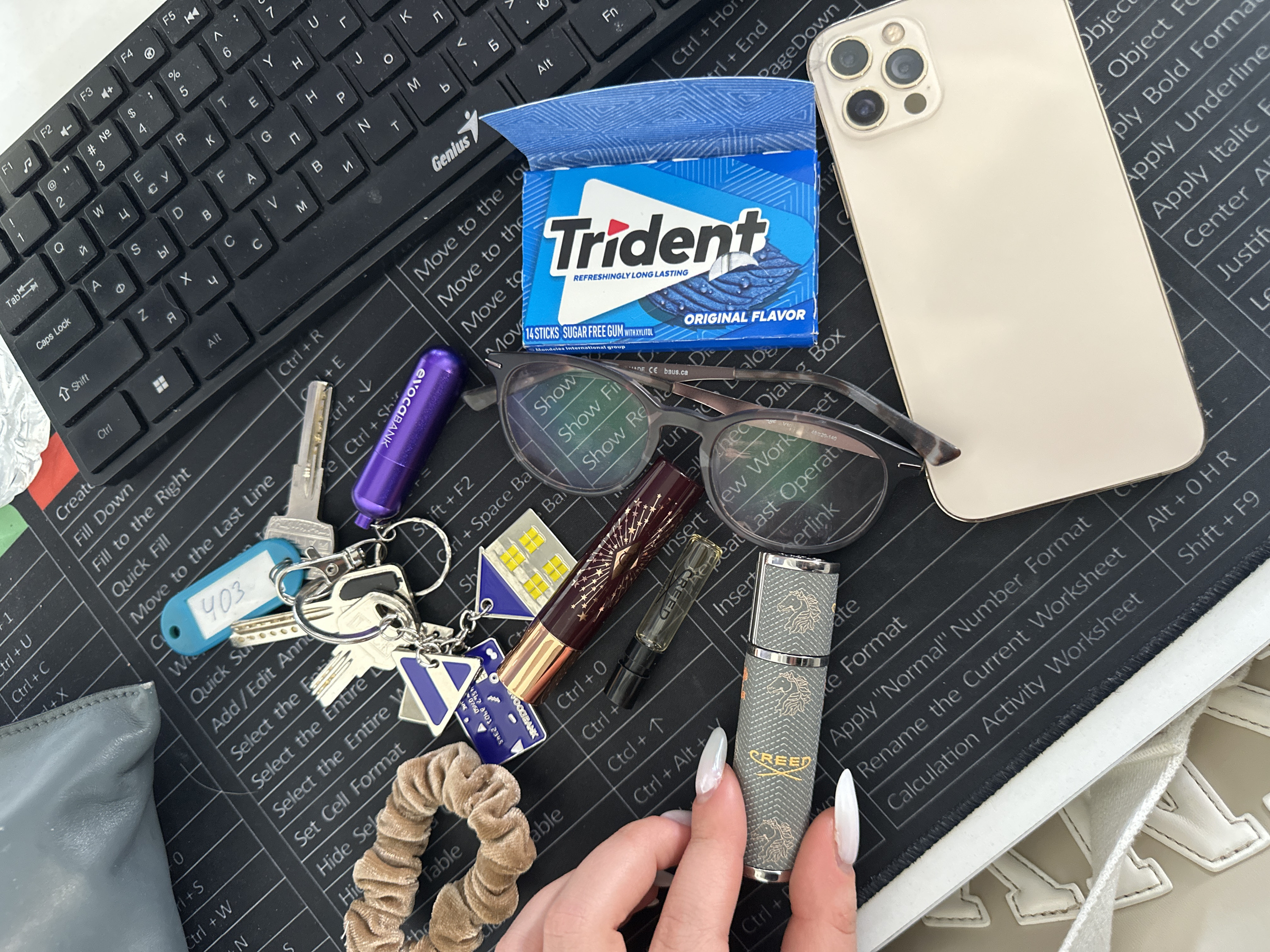 The image displays a flat lay composition of personal and office items laid out on a dark grey desk pad in Zovuni, Armenia. The desk pad features numerous white text labels detailing keyboard shortcuts, primarily for spreadsheet software. A black Genius-brand computer keyboard, displaying both Latin and Cyrillic characters, occupies the upper right portion of the frame, partially covering the desk pad. Prominently featured objects include: * A set of keys on a metal ring with multiple keychains: a light blue rectangular keychain marked "403," a blue and white triangular keychain, a blue rectangular keychain with "EVOCABANK" in reverse text, a metallic house-shaped keychain with yellow windows, and a small metallic purple cylindrical keychain also marked "EVOCABANK." * A light brown velour scrunchie is positioned to the left of the key set. * A dark brown cylindrical object with gold starburst patterns, possibly a rollerball perfume, lies below the keys. Adjacent to it is a small clear glass rollerball vial with a clear liquid, bearing a "CREED" label. * A pair of dark-framed reading glasses with rectangular lenses rests face down, reflecting text from the desk pad. * A partially opened blue pack of "Trident Original Flavor" sugar-free chewing gum, containing 14 sticks, is situated next to the keyboard. * A light gold-colored smartphone, equipped with a triple camera module and encased in a clear protective cover, is positioned in the lower right corner. A fair-skinned hand with long, oval-shaped white manicured fingernails is present in the lower-left quadrant, holding a grey textured cylindrical perfume atomizer with silver accents. The atomizer is branded "CREED" in gold lettering and features a gold embossed heraldic emblem. A grey-blue textured object, possibly a pouch or bag, is visible in the upper-left corner of the frame.