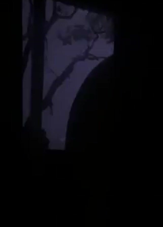 The video begins with blackness. Suddenly, a rectangular opening appears, revealing a view from an interior. Outside, a tree and foliage are partially visible, with a glimpse of a shore and water in the distance. Someone is seated in the foreground. The opening closes, returning the video to black.