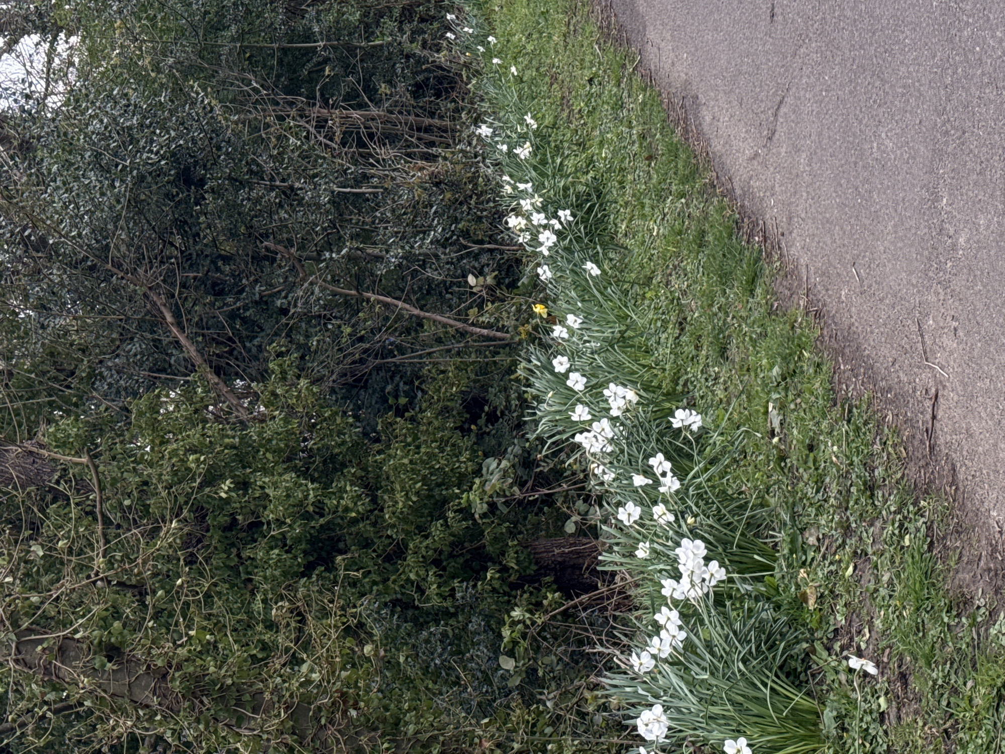 The image displays an outdoor scene in the city of Tonbridge and Malling, United Kingdom. A dark gray asphalt or tarmac path, exhibiting some surface wear and minor cracks, occupies the lower right portion of the frame, extending diagonally towards the mid-left. Bordering this path is an unmanicured grassy verge, approximately 1-2 meters wide, populated by green vegetation and scattered organic debris. A dense, linear arrangement of white daffodils (Narcissus) in full bloom dominates the midground, characterized by their bright white petals and vibrant green leaves and stems. One distinct yellow daffodil is visible towards the left side of this floral line. The background features a dense, verdant treeline and shrubbery composed of various deciduous and evergreen trees and bushes, with ivy vines visibly climbing tree trunks. The overall lighting is diffused, suggesting an overcast sky. No individuals, animals, or artificial structures beyond the path are present.