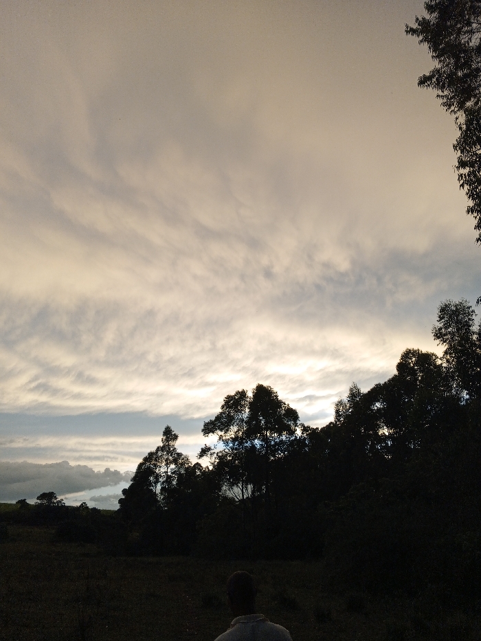Silhouetted trees dominate the middle ground against a dramatic sky filled with striated clouds, hinting at sunset or sunrise. A hint of rolling hills lies in the distant left, shrouded in mist. In the foreground, a figure stands with their back to the viewer, observing the scene. The overall mood is peaceful yet slightly melancholic, with the play of light and shadow emphasizing the beauty of the natural landscape.