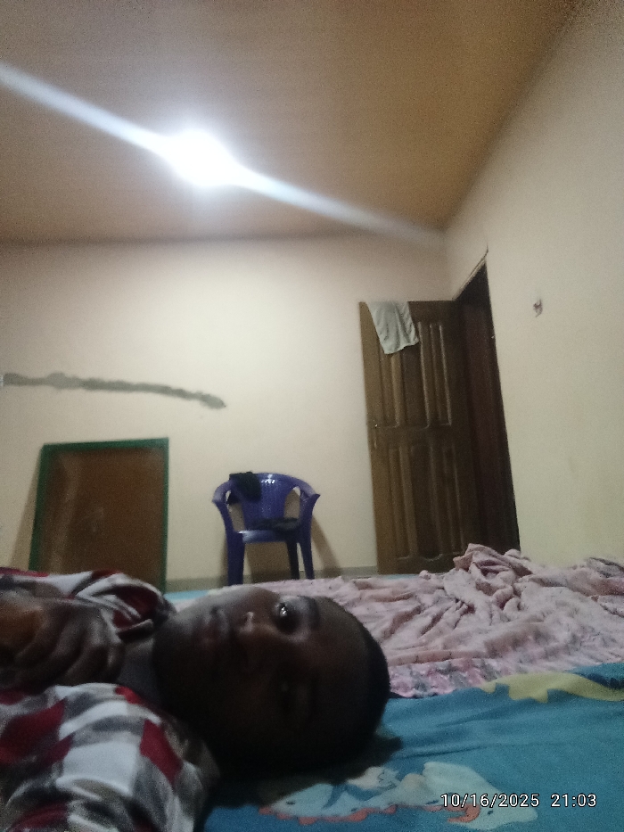 The image depicts an indoor scene, likely a bedroom, at 21:03 on 10/16/2025. In the foreground, a person with dark skin and short dark hair is lying on their back on a blue patterned sheet, looking towards the camera. They are partially covered by a red, white, and black checkered fabric. To their right, a rumpled pink blanket is visible on the bed or floor. The room features light-colored walls and ceiling, illuminated by a bright, single overhead light fixture that produces significant glare. On the left wall, a horizontal dark grey streak or patch is present. A dark-framed object with a green border rests vertically on the floor against the left wall. Towards the center-right, a dark blue plastic chair holds a dark piece of clothing on its backrest. A partially open dark brown wooden door is visible on the far right, with a light-colored towel draped over its top edge. The location is Unknown, Unknown.