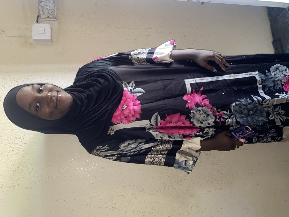 A female subject stands facing the camera in an indoor setting within Hotoro South, Nigeria. She is wearing a black hijab and a black, long-sleeved, loose-fitting dress patterned with large pink, grey-blue, and white flowers, featuring ruffled cuffs. Her left hand holds a smartphone with a purple and pink decorated case, visible at her side. The subject displays a slight smile and direct gaze. The background is a textured, light-colored wall, with a white electrical switch assembly, comprising two rocker switches, mounted to the subject's upper right.