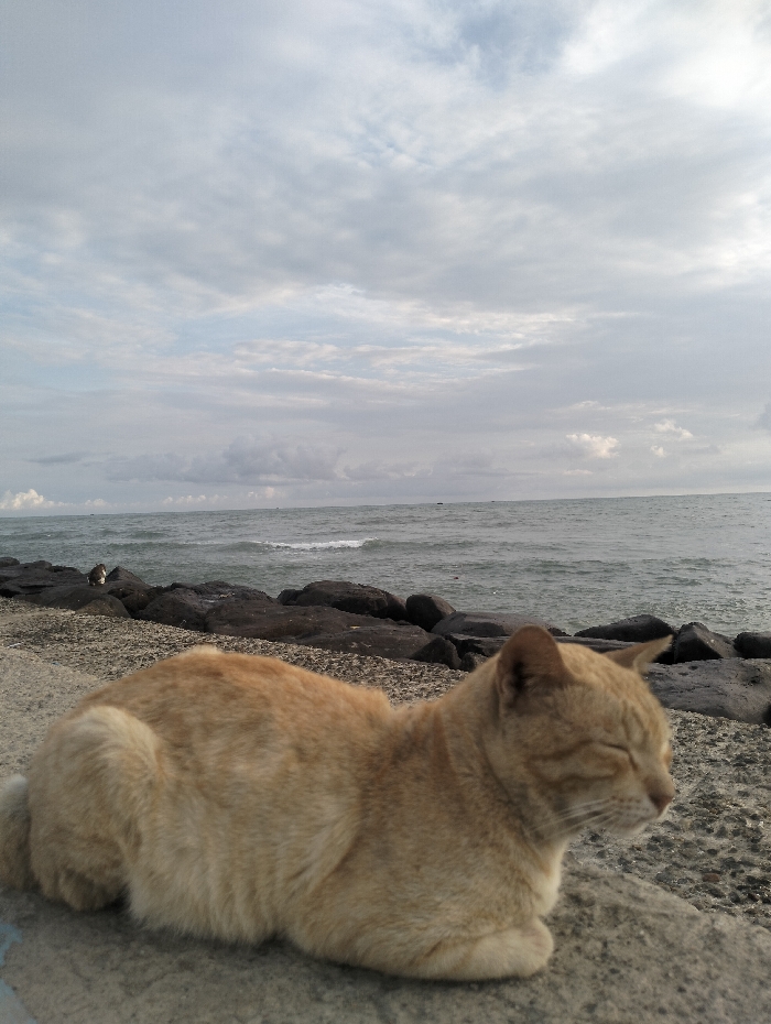 - "An orange tabby cat lies on a concrete ledge near a rocky shoreline" by FM-sAcf03, licensed under CC BY 4.0