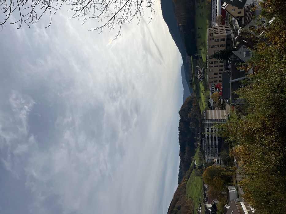 The image displays a panoramic view of the town of Oppenau, Germany, situated in a valley surrounded by hills. The sky is partially overcast with a mix of light grey and white stratocumulus clouds, showing brighter illumination towards the upper right quadrant. In the immediate foreground, dark green and orange-yellow deciduous tree foliage partially obscures the lower section of the scene, with distinct bare tree branches visible along the far right edge of the frame, extending into the sky. The midground consists of the town's built environment. Multiple buildings are present, including a multi-story structure on the left with a grey facade and horizontal windows, alongside a lighter beige/tan section. To its right, another modern, four-to-five-story building with a light brown/tan facade and dark windows is prominent. Numerous residential structures with pitched, dark-tiled roofs and light-colored facades are scattered throughout the town area. Roads and parking areas are visible between structures. Deciduous trees displaying autumn colors (yellow, orange, and red foliage) are interspersed among the buildings, with a notable red-leafed tree near the center-right. No individuals or specific actions are discernible. The background features rolling hills that define the valley. These hills are covered by a combination of dark green coniferous forests and lighter green grassy areas, indicative of meadows or fields. Patches of deciduous trees on the hillsides exhibit autumn hues of orange and brown. Distant hills appear bluer due to atmospheric perspective. A slender, mast-like structure, potentially a communication tower, is visible on a mid-left hillside. Smaller, indistinct buildings are sparsely distributed on some of the green slopes. The scene is illuminated by diffused natural light, consistent with an autumnal day.