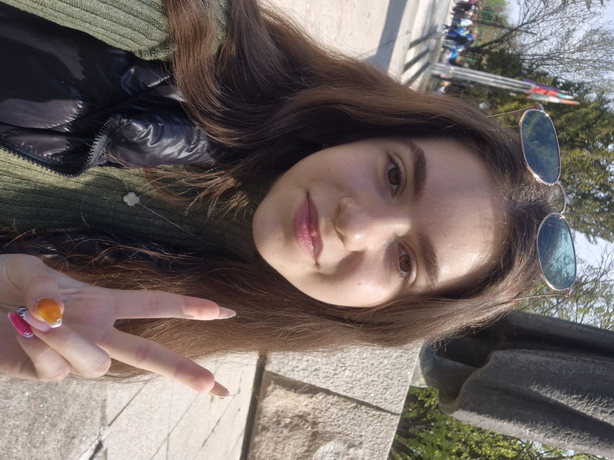 A young woman takes a selfie outdoors. She is wearing a green sweater and a black puffer jacket. Sunglasses are perched on her head. She is making a peace sign with her left hand, which has brightly colored nail polish. In the background, there are trees, other people, and a body of water. The location is most likely Byala Cherkva, Bulgaria.