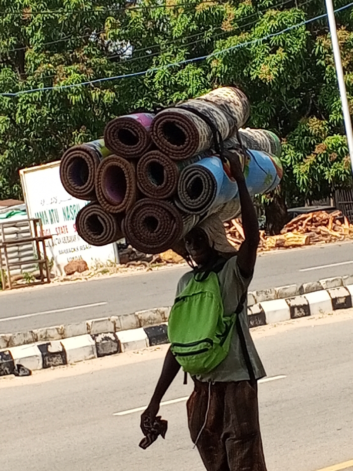 In Adankolo, Nigeria, an individual is depicted walking along a paved road under bright daylight. The subject, appearing male, wears a light-colored short-sleeved top, dark trousers, and a neon green backpack. He carries a vertical stack of approximately ten to twelve multicolored, rolled mats on his head, with his left arm raised to stabilize the load. A dark, indistinct object is held in his right hand. The road features a white solid line and a black-and-white checkered concrete curb. In the left background, a white rectangular sign displays partial text, including "JAMA'ATU NASRUL ISLAM," "KOGI STATE," "DR. ABUBAKAR'S ROAD," and "LOKOJA." Further in the background, a pile of cut logs is visible on the right, and dense green foliage from trees dominates the upper portion of the scene.