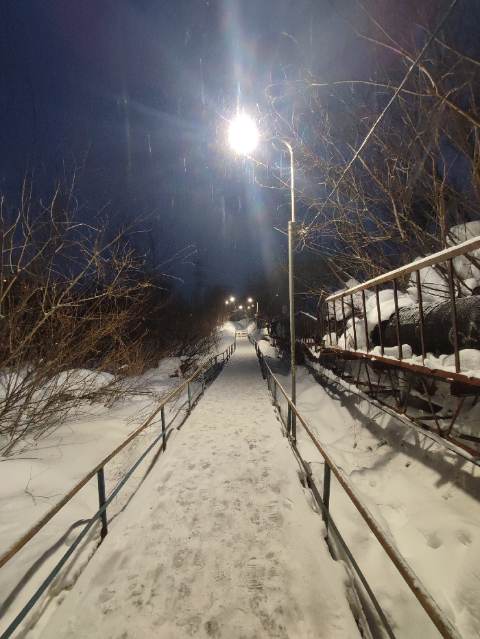 The image depicts a snow-covered pedestrian pathway or staircase at night in Izhevsk, Russia