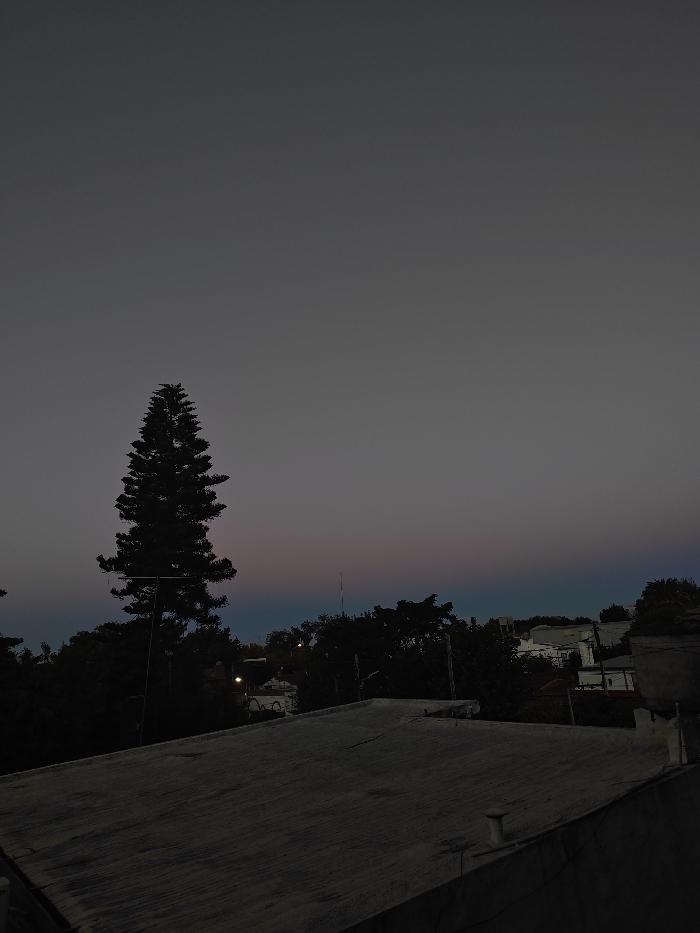 The image depicts an urban or suburban twilight scene in La Plata, Argentina, observed from an elevated vantage point. The sky occupies the upper two-thirds of the frame, transitioning from a dark gray overhead to a subtle horizontal band of muted purplish-pink and blue-green hues at the distant horizon, indicating dusk or early night. In the lower left quadrant, a tall, dark coniferous tree is prominently silhouetted against the sky, its dense foliage obscuring detail. A horizontal, thin, dark bar or antenna is affixed to the lower trunk of this tree. Below the horizon line, a dense canopy of dark trees and shrubs forms a jagged silhouette across the midground. Beyond this foliage, fragmented views of a residential area are visible, characterized by dark building outlines and rooftops. Multiple small, distant points of artificial illumination, consistent with streetlights or interior building lights, are present within the obscured urban landscape. The immediate foreground on the right consists of a flat, light gray concrete rooftop, showing surface texture and two small, white, cylindrical ventilation pipes near its right edge. No individuals or specific actions are discernible within the frame.