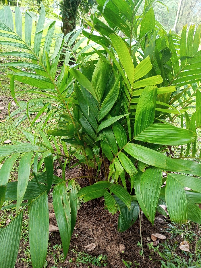 A vibrant cluster of green palm-like plants dominates the scene. The plants display long, pinnate leaves with a rich green hue and a slightly glossy sheen. The base of the plants is surrounded by a mixture of brown, fibrous material and small rocks. The backdrop features a blurred landscape of grass, trees, and a hint of sunlight filtering through the foliage.