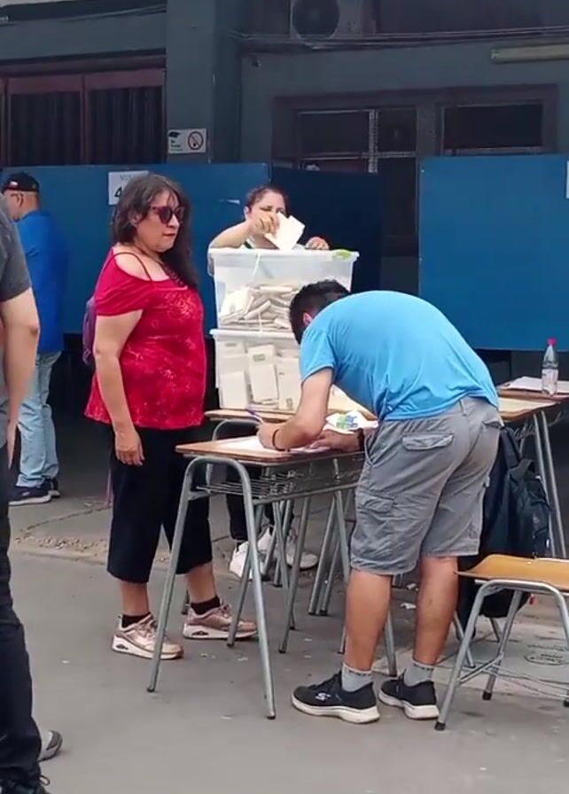 person signing a document at a table, with a woman in a red shirt standing next to them. A woman behind them is holding a piece of paper near a box labeled "MESA 465." Other people are visible in the background. The scene appears to be outdoors, possibly at a polling station.
