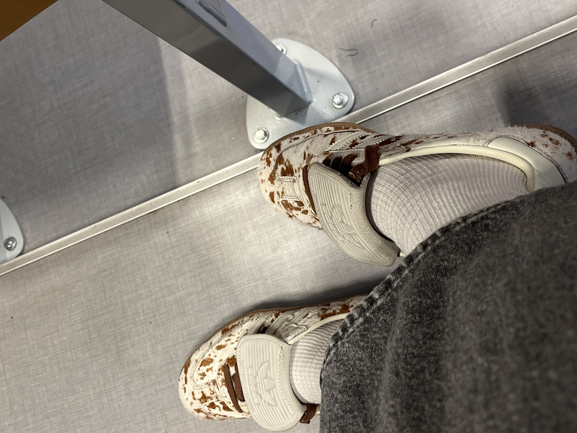 The image captures a downward-facing perspective of an individual's lower extremities positioned on a light grey, textured floor. The person wears dark grey, textured pants, partially visible on the left, and white ribbed socks. Both feet are clad in Adidas sneakers featuring a white and brown cow-hide or dalmatian-like pattern, brown laces, and a light grey, ribbed tongue flap embossed with the Adidas trefoil logo. To the right, a grey metal support pole is anchored to the floor by four bolts on an irregular hexagonal base plate. A thin, reflective metal strip is embedded in the floor, extending from the left side of the frame towards the right. The specific location within the city of Lyon, France, is not identifiable from the visual evidence provided.