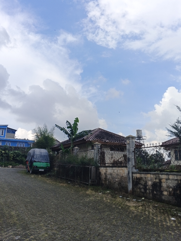 The image depicts a residential street scene in Unknown, Cambodia, under a partly cloudy sky with visible blue patches