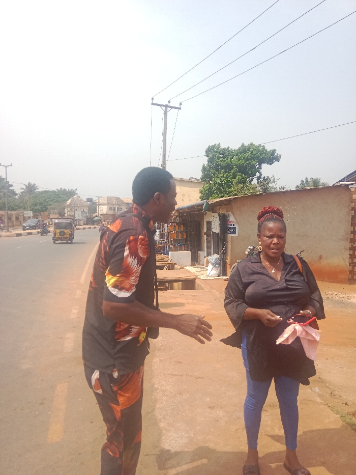 The image depicts an outdoor urban scene in Aguata, Nigeria, under bright, hazy daylight conditions