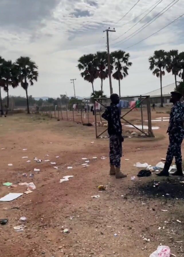 n outdoor area with a dirt ground and litter scattered around. In the initial frame, two individuals in camouflage uniforms stand near a pile of trash and a wire fence. The background features palm trees and a white tent-like structure. Subsequently, a man in casual clothing walks into the frame. Then the camera pans to reveal a silver car parked near a building with multiple stories and balconies. Several people are standing on the balconies and in the entrance of the building, observing or interacting with the scene. The overall environment appears to be a public space with a mix of activity and visible litter.