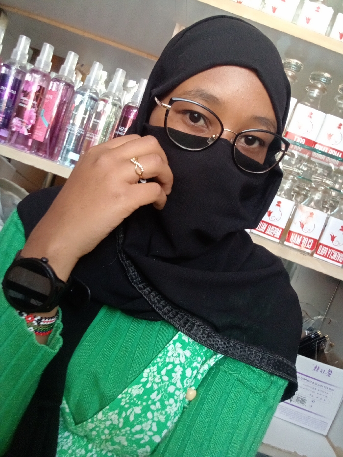An individual, likely female, is depicted in a close-up, chest-up indoor shot, stated to be within a retail establishment in Nyeri, Kenya. The person wears a black hijab/niqab that covers their hair and lower face, with only their dark eyes and forehead visible. They are wearing black-framed glasses with gold-colored bridge and temple accents. A gold-colored ring, featuring an infinity symbol design, is on their right ring finger. The right hand is raised, with fingers resting on the black fabric covering the lower face. On the left wrist, a black smart watch is visible above a multi-colored beaded bracelet, resembling a traditional Maasai design. The person is wearing a green ribbed top, and beneath it, a green garment with a white floral/leaf pattern and a small wooden bead is partially visible. The background features two distinct sets of products on shelves. To the left, several clear glass spray bottles containing liquids of various colors (e.g., purple, pink, light blue) are displayed, suggestive of body mists or perfumes. To the right, numerous smaller, clear glass bottles with red and white labels, some bearing a rooster or tulip logo and text like "IMPERIAL" and "GUILD," are arranged, indicating perfume or essential oil products. The individual is looking directly into the camera.