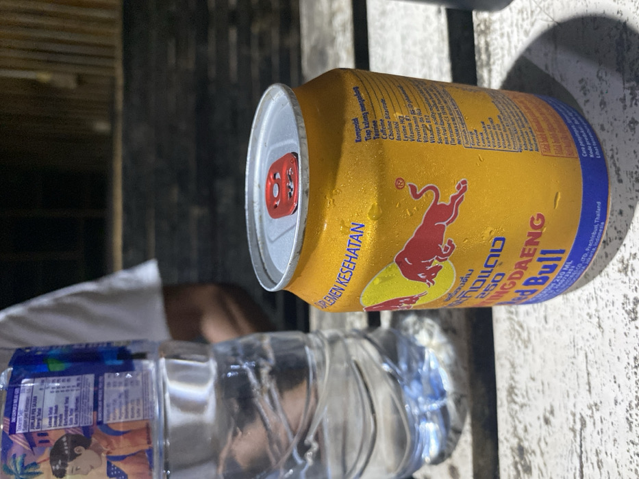 The scene is set on a light-colored, textured surface, likely a wooden table, in Seuneubok Teungoh, Indonesia. A chilled, unopened Kratingdaeng (Red Bull) energy drink can, 250 ml, stands prominently in the foreground. The can is yellow with a blue base, displaying the red bull logo and text "SUPLEMEN KESEHATAN" and "PT. Greatwall, Jakarta, Indonesia." Condensation droplets are visible on its surface. To the left, a clear plastic bottle of water is partially visible, featuring a blue label with an illustration of a boy and nutritional details. In the blurry, dimly lit background, the upper arm and shoulder of an individual wearing a white short-sleeved shirt are discernible. No active interactions or specific actions are taking place.