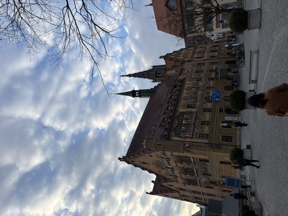 An outdoor scene in Ulm, Germany, depicts the Ulm Rathaus (Town Hall) on a cloudy day