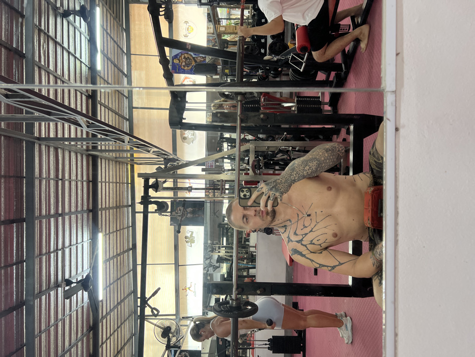 A shirtless man with tattoos is taking a selfie in a gym mirror. He is holding a smartphone in his left hand. Behind him, a woman wearing a white top and shorts is working out with weights. Other gym equipment and people are visible in the background. The gym has a high ceiling with exposed beams and fans.