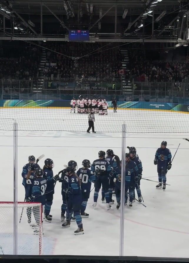 women's hockey game from an elevated vantage point. The Finnish women's hockey team in dark teal uniforms are huddled together on the ice. The Canadian team, in red and white, huddles at the opposite end of the rink, closer to center ice. An official stands between the two teams. A large crowd fills the stands. The video is shot through a glass partition surrounding the rink. A scoreboard is visible in the background.