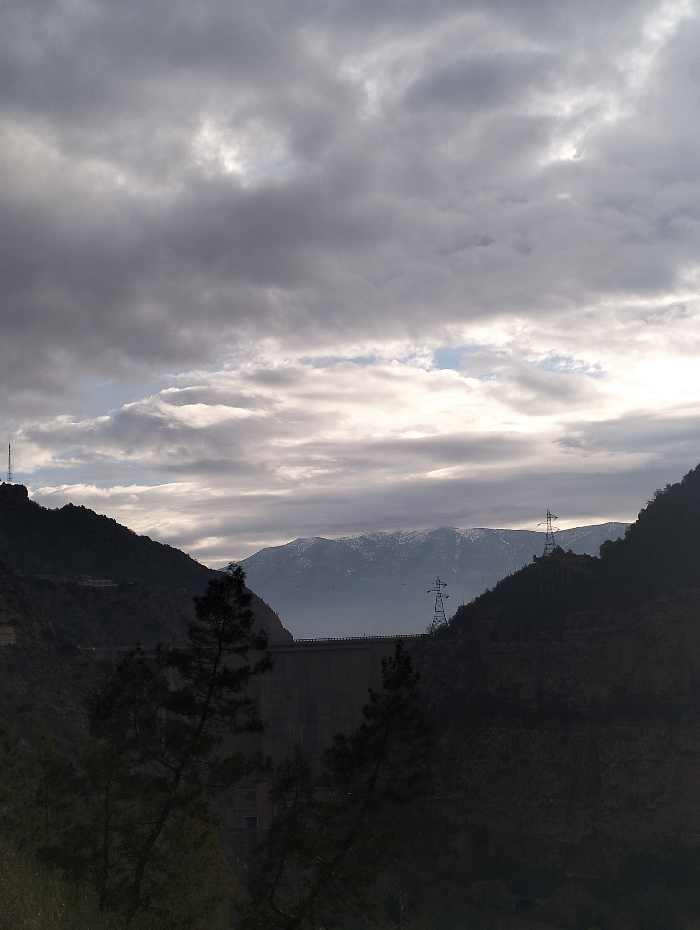 The image depicts a panoramic view of the Bin el Ouidane Dam area in Bin El Ouidane, Morocco. The scene is dominated by a heavy, overcast sky composed of multiple layers of gray clouds, with brighter patches indicating a distant light source, particularly towards the lower horizon. In the mid-ground, the massive concrete structure of the Bin el Ouidane Dam spans a valley, appearing dark and silhouetted against the lighter background. The dam's facade reveals vertical structural elements. Flanking the valley are rugged mountain slopes, also appearing dark and heavily shadowed in the foreground and mid-ground. Several dark, coniferous trees are visible on these slopes, primarily in the lower portion of the frame, contributing to the foreground silhouette. On the ridges of the mountains, two prominent electricity pylons are visible; one on the mountain to the left of the dam and another on the mountain to the right. A slender, antenna-like structure is discernible on the far left peak of the mountains. In the distant background, a range of snow-capped mountains is faintly visible above a layer of atmospheric haze, appearing lighter in color. No individuals, animals, or explicit actions are observed within the frame. The overall lighting is subdued, creating a high-contrast scene with dark foreground and mid-ground elements against the brighter sky and distant features.