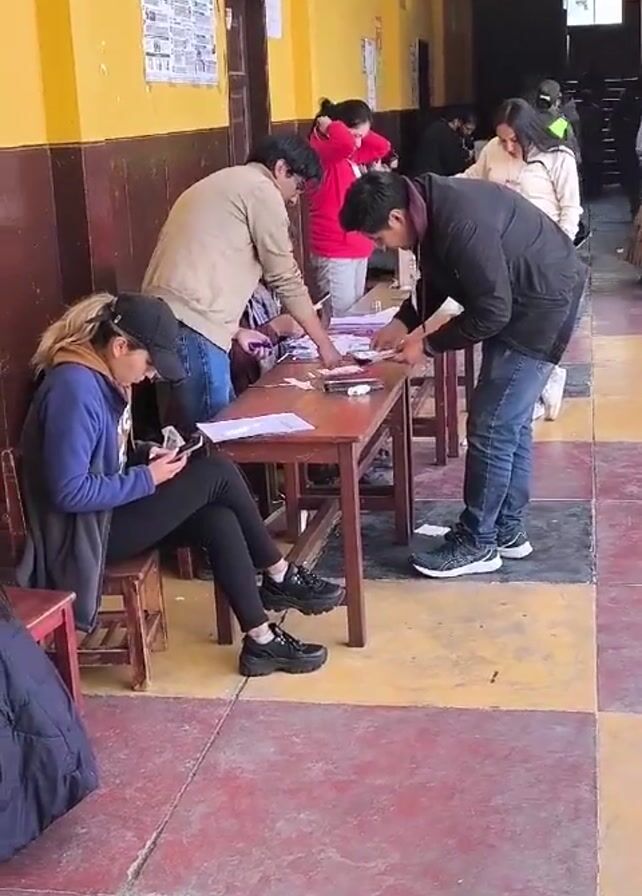 The scene shows a hallway in what appears to be a public building, possibly a school or community center, with yellow and brown walls. Along one wall, several people stand at small wooden tables, looking at documents or filling out forms. A woman sits on a small wooden chair, looking at her phone. Additional people can be seen moving in the background, further down the hallway. Some are dressed in civilian clothing, and what appears to be a police officer can be seen. The floor is tiled with a pattern of red, yellow, and brown squares. There are various posters and notices attached to the yellow wall. The overall impression is that of a registration process or voting taking place in a public area.