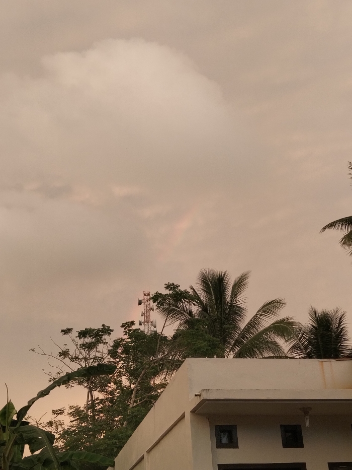 This image captures an outdoor scene in Panton, Indonesia, under an overcast sky displaying soft, pale orange-beige hues, indicative of either dawn or dusk. The upper two-thirds of the frame are dominated by clouds with subtle variations in tone. A faint, partial atmospheric optical phenomenon, possibly a rainbow segment, is visible within the cloud cover above the horizon in the upper-left quadrant. In the midground, a prominent, tall lattice-style cellular communication tower, equipped with multiple antenna arrays, stands on the left, partially obscured by dense green foliage. Numerous tropical trees are present, including several large palm trees with dark green fronds that extend into the sky, primarily on the right side and above a building. Other deciduous trees with smaller green leaves are interspersed. A large-leafed plant, likely a banana plant, is visible in the lower-left corner. The lower right quarter of the image features the upper section of a light-colored, possibly cream or off-white, multi-story building with a flat roofline and a slight overhang. The visible facade includes at least two dark-framed, square openings, consistent with windows or vents. No individuals or active interactions are depicted within the scene.