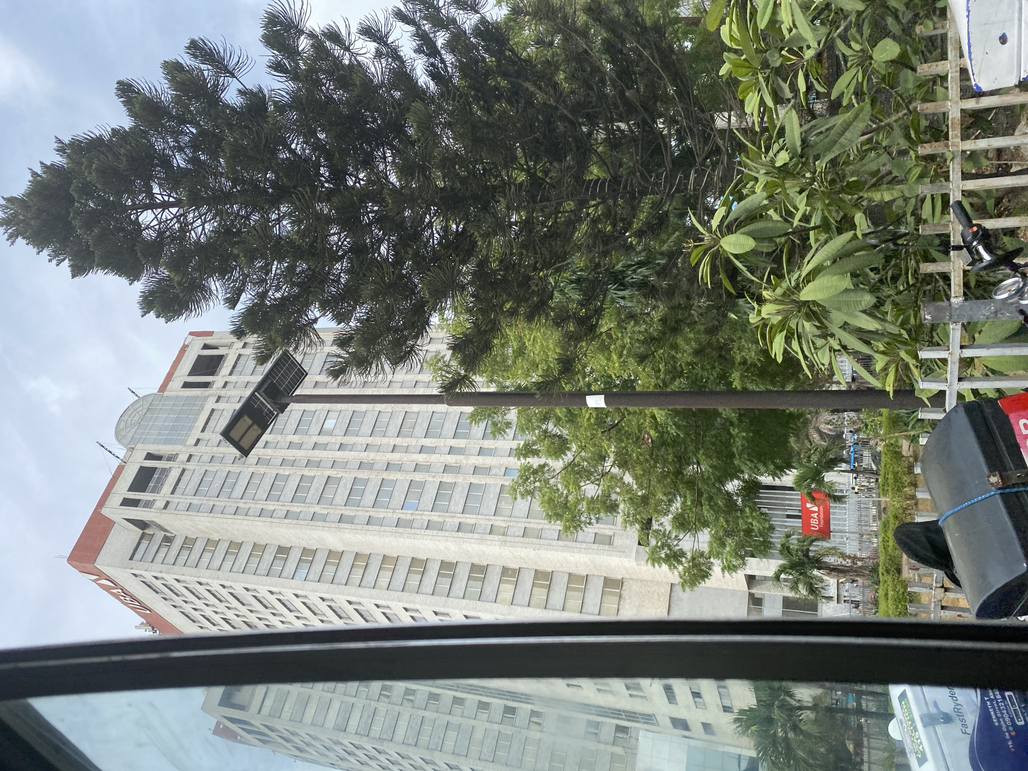 The image displays a street scene in Lagos, Nigeria, centered on the UBA House building, located at 57 Marina, Lagos Island. The photograph is taken from within a vehicle, with a dark window frame partially obscuring the left side of the view. In the foreground, a weathered metal fence runs horizontally. Behind this fence, a dark-colored delivery box secured with blue strapping and a partially visible blue and white delivery box labeled "FastRyder" are present, along with a motorcycle handlebar on the right. The midground features dense green vegetation, including a prominent, tall, dark green coniferous tree dominating the right side, and various leafy shrubs and smaller trees. A black streetlight with a solar panel array at its apex stands in the center-right. Further back, a red sign displaying "UBA Foundation" is visible among the trees. Several indistinct human figures are present on the ground level near this sign. The background is dominated by the multi-story UBA House, characterized by its light grey facade, numerous rectangular windows, and a distinctive reddish-brown roofline with the "UBA" logo prominently displayed. The building features architectural elements like vertical fins and a curved glass section at its summit. To the left, another tall, grey building with multiple windows is visible, likely an adjacent structure or reflection. The sky above is overcast and light grey.