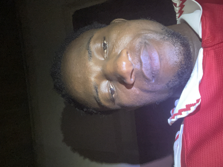 A close-up, tilted portrait features a dark-skinned man. His eyes are open and glisten slightly. He has short, dark hair and a beard. He wears a red shirt with a distinctive white and red patterned collar. The background is dimly lit, casting shadows on the left side. The lighting is uneven, highlighting certain facial features.
