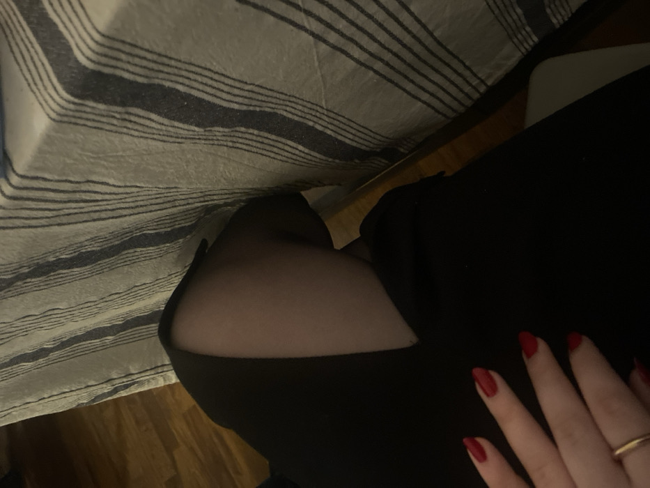 A person's hand with red painted nails and a gold ring lies on top of black leggings. The leggings appear to have sheer panels on the thighs. The person's leg is next to a striped tablecloth draped over a table, with a wooden floor visible below. The lighting is dim, creating shadows on the surfaces.