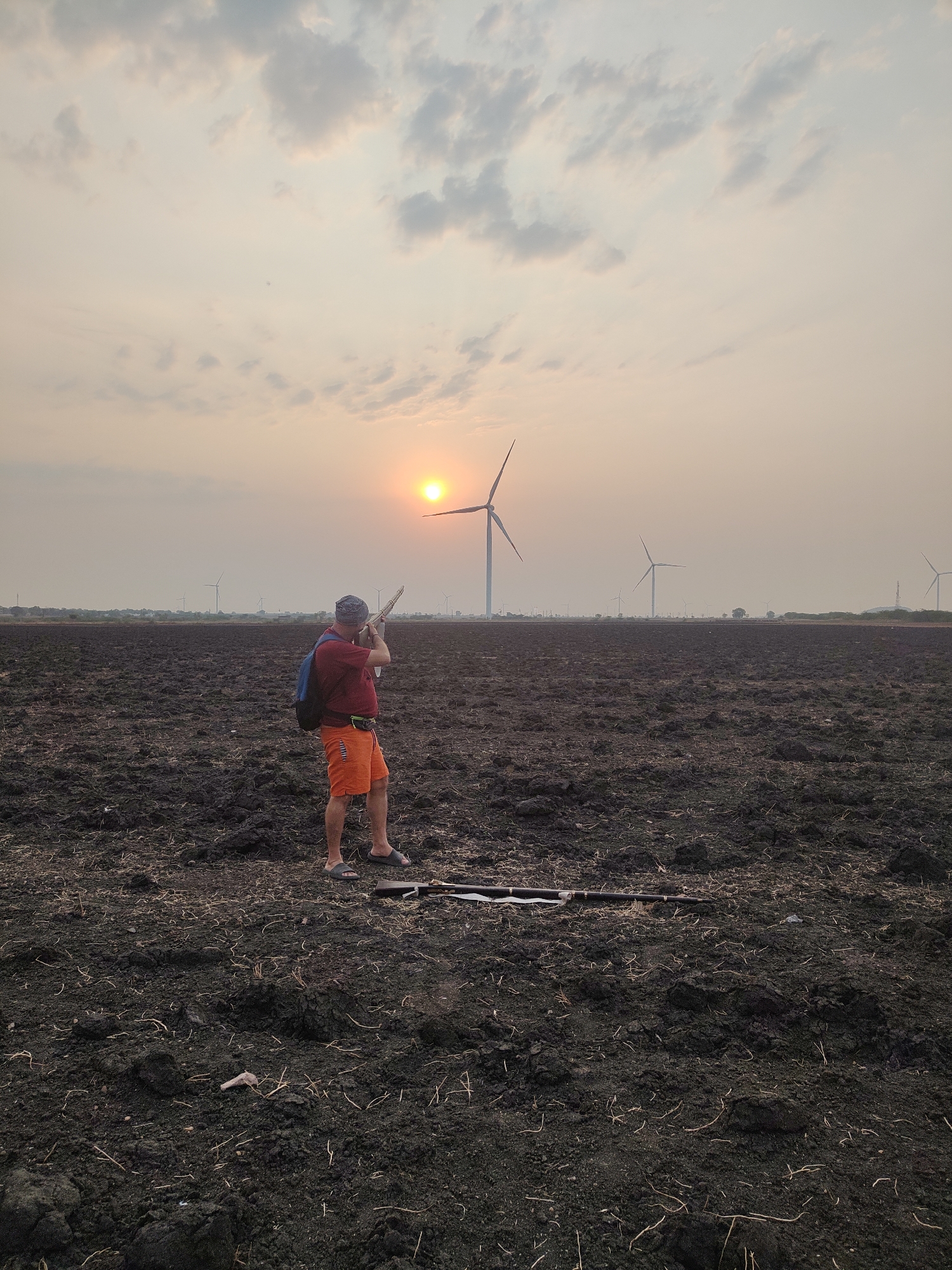 In Kottalapalli, India, an adult male stands in a large, dark, tilled agricultural field at sunset. He is positioned facing slightly away from the viewer, towards the setting sun, which is a bright orange disc on the horizon. The man is dressed in a dark red t-shirt, orange shorts, grey slide sandals, and a blue backpack, with a blue beanie and a fanny pack also visible. He holds a light-colored long gun, possibly a shotgun or rifle, aimed upwards and to the right, towards the sunset and a prominent wind turbine. A second, darker long gun, resembling a shotgun, lies horizontally on the tilled earth to his immediate right. In the background, numerous white wind turbines are visible across the expansive, hazy landscape under a sky with scattered light clouds tinted orange and pink by the low sun.